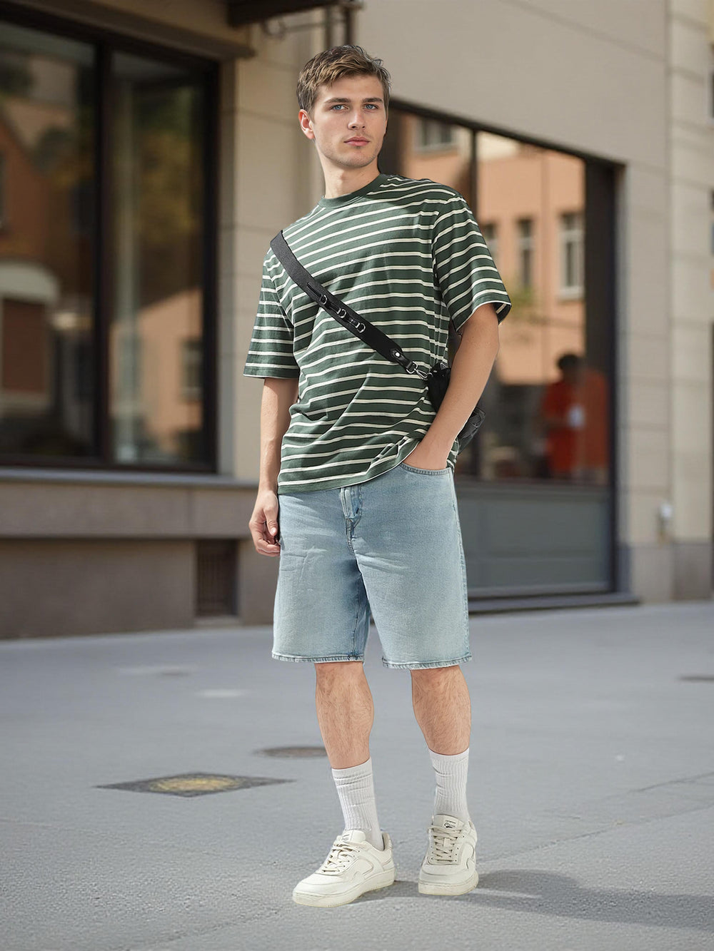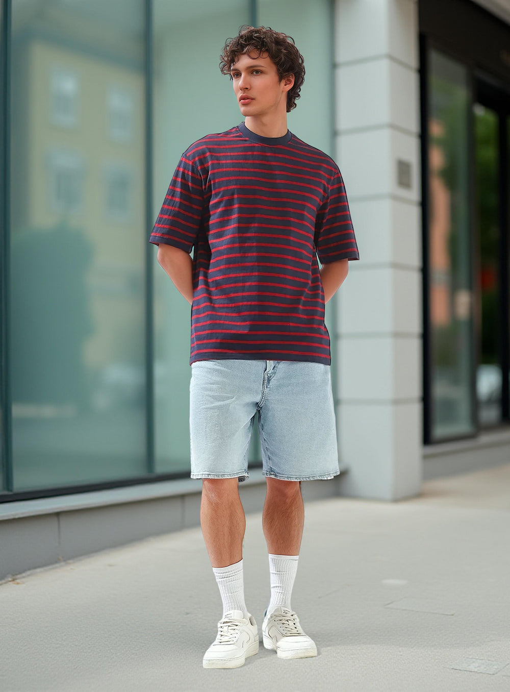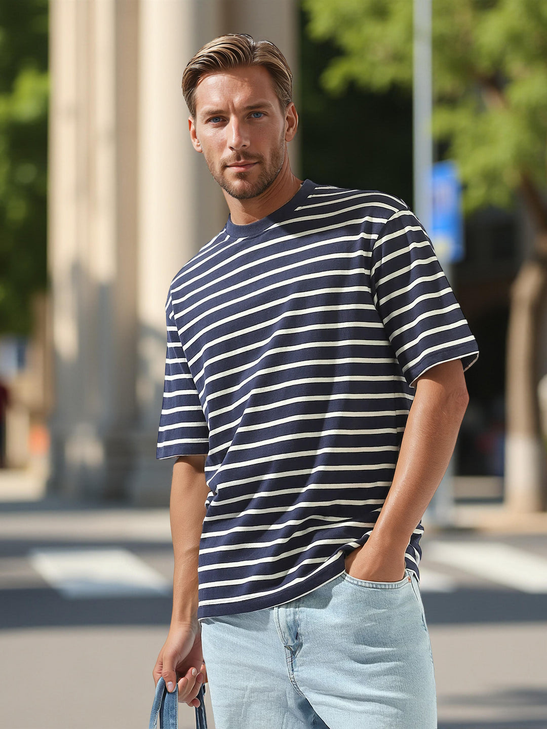 High Star Men Striped Round Neck Pure Cotton Oversized T-shirt